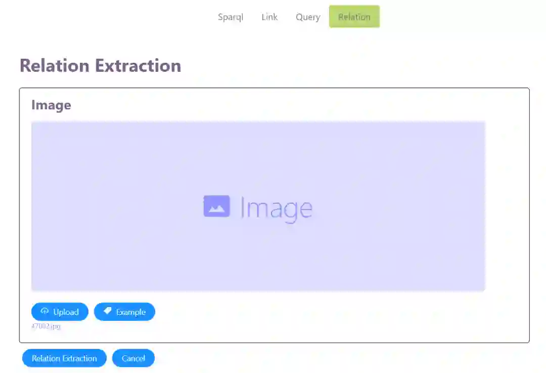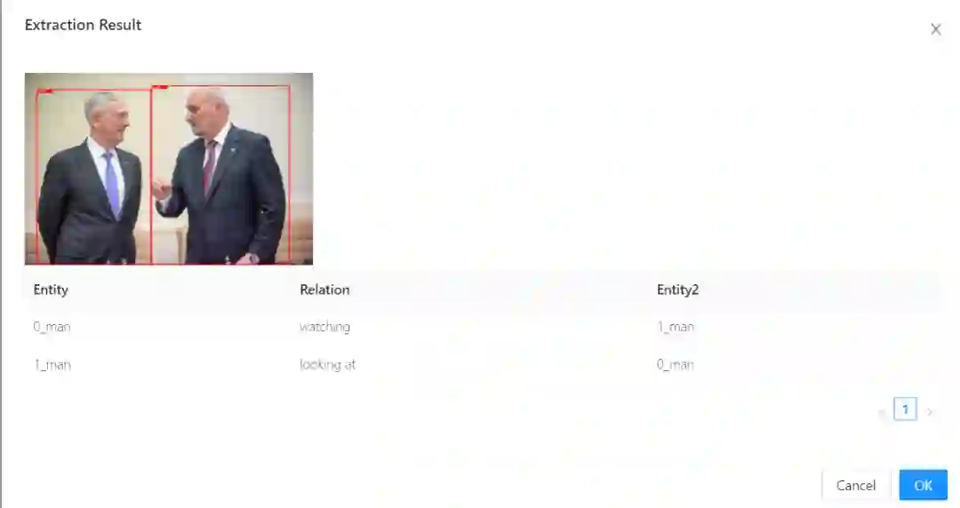 Relation Extraction:关系抽取部分会分析使用者提供的图片,检测出图片中的目标以及目标之间的关系。该部分主要应用了场景图生成的技术。可以使用该页面提供的样例来查看预测的结果。