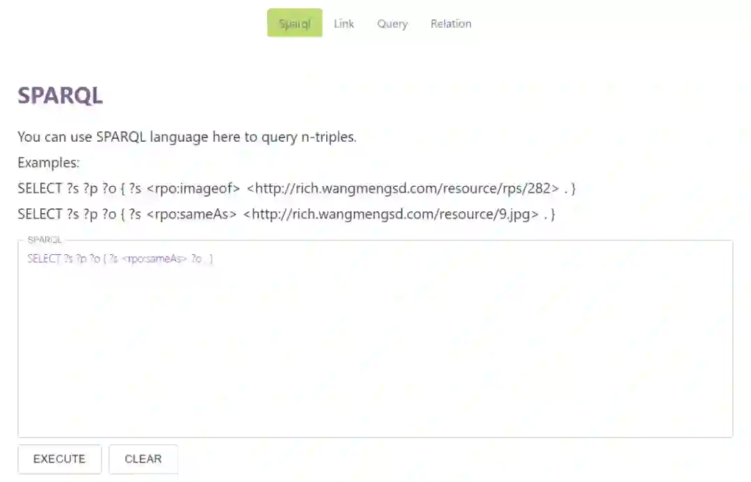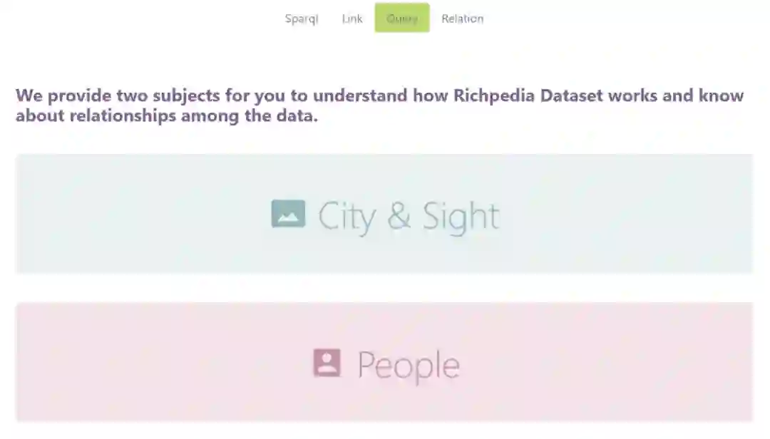 SPARQL:为了方便使用者查询OpenRichpedia,网站提供了基于AllegroGraph的SPARQL查询接口。有使用SPARQL语言可以查询知识库中的知识三元组。更详细的使用说明可以参考SPARQL页面。