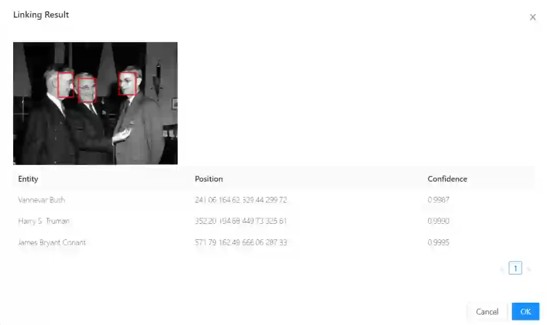Entity Linking:实体链接会根据使用者提供的文本和图片来将图片和文本中的实体链接起来。其主要涉及目标检测,文本实体识别以及知识图谱实体对齐等技术,通过引入知识图谱的背景知识来提升实体识别的效果。可以使用该页面提供的样例来查看预测的结果。