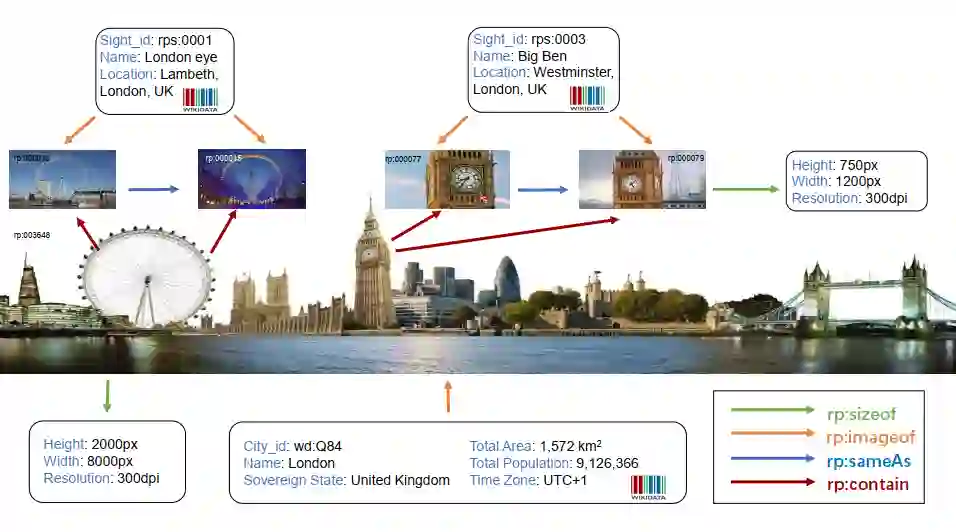多模态知识图谱与传统知识图谱的主要区别是,传统知识图谱主要集中研究文本和数据库的实体和关系,而多模态知识图谱则在传统知识图谱的基础上,构建了多种模态(例如视觉模态)下的实体,以及多种模态实体间的多模态语义关系。例如在OpenRichpedia中,首先构建了图像模态伦敦眼图像与文本模态知识图谱实体(DBpedia实体:London eye)之间的多模态语义关系(rpo:imageof),之后还构建了图像模态实体伦敦眼与图像模态实体大本钟之间的多模态语义关系(rpo:nextTo)。