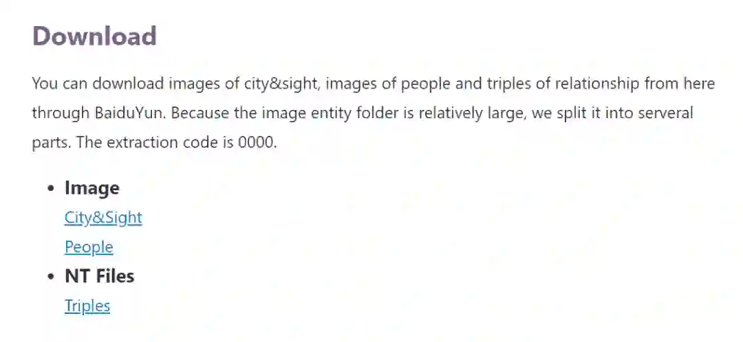 Download:该页面提供了OpenRichpedia多模态知识库的图片和NT文件资源,开放给研究者们使用。