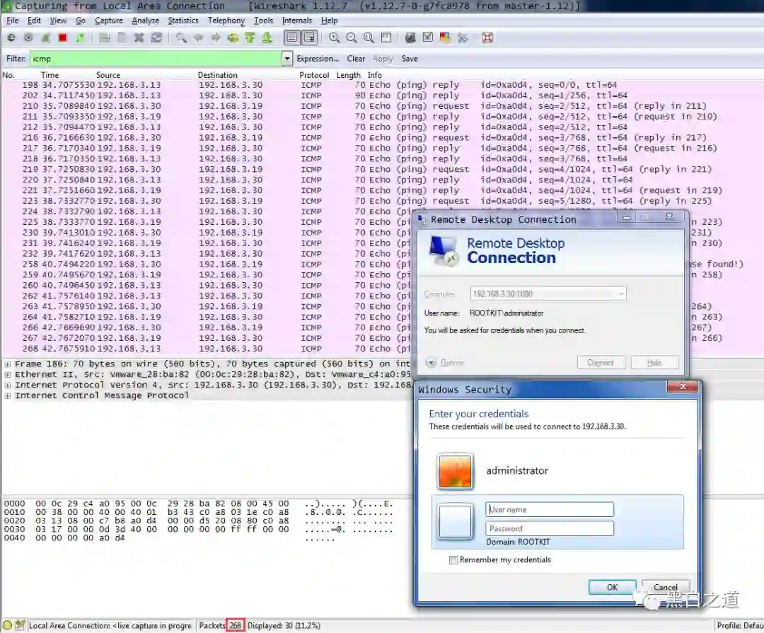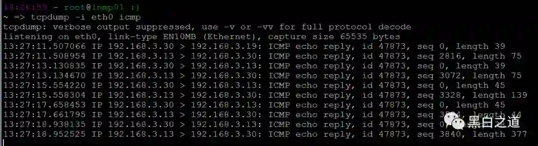 在wireshark下我们很清晰的看到了这一过程,只是这个icmp请求过于密集,很容易触发各种ids