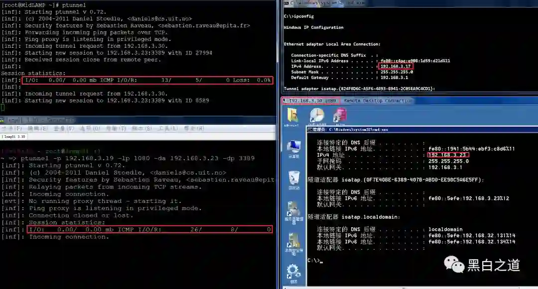 就相当于进入了刚刚打通的icmp隧道,然后把到win2008R2cn的指定的端口数据都封装到这个隧道里面进行传送