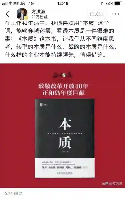 近日,美的集团董事长兼总裁方洪波罕见地在其个人社交媒体账号为一本小黑书积极打CALL,阅读量超过了20万。