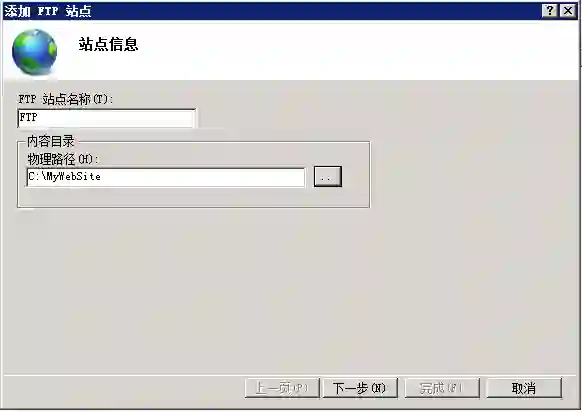 接着,在IIS网站右键选择“添加FTP站点”,选择FTP文件物理路径和添加站点名称: