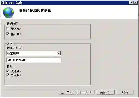 端口默认21,不用选择SSL证书,身份验证这里选择基本验证(为了一定的安全性,不要勾选匿名),授权访问里,指定administrator才能访问FTP站点,并具有读取和写入的权限;