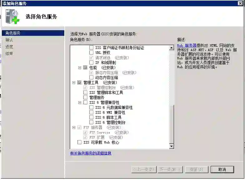再次选中已安装的IIS服务,增加FTP服务器相关的角色: