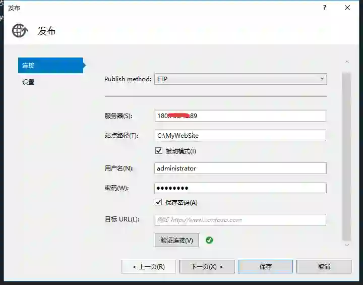 配置完外网服务器,我们来配置一下本地VS2017,右键项目-->发布,选择FTP发布,选项配置如下: