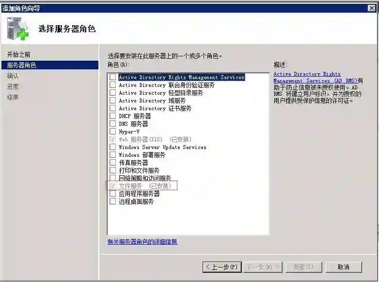 Server2008添加新的角色,选中文件服务并安装新角色: