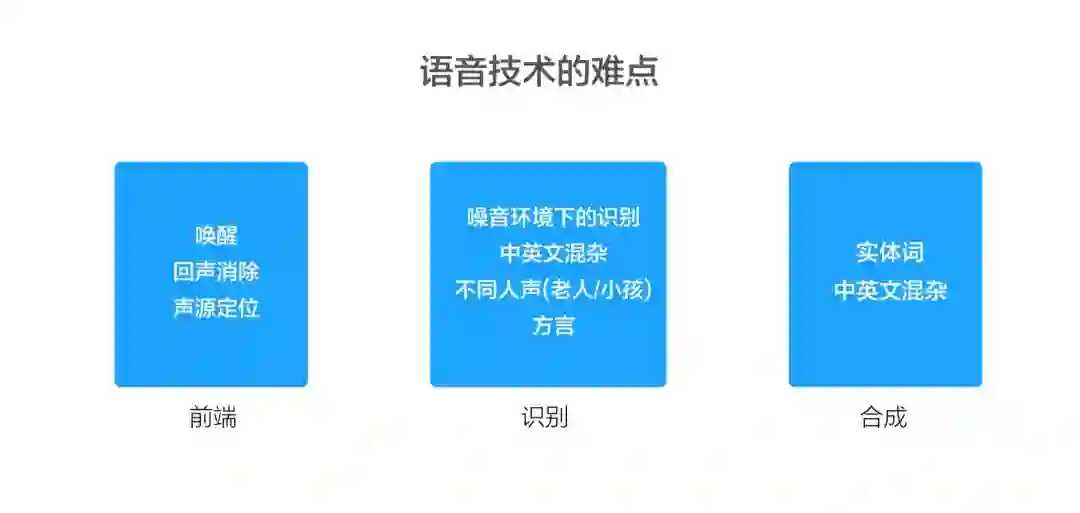 具体展开而言的话,语音技术的难点,其实还挺复杂的。首先是前端包括唤醒技术、回声消除和声源定位,大家用了小爱同学,可以发现其实它在这方面其实还是有许多问题的。