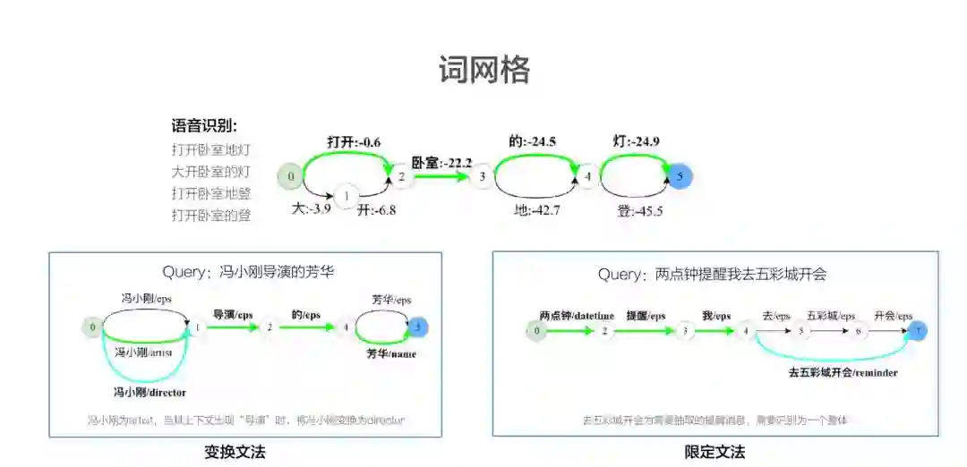 另一个例子是,我想看功夫电影和我想看周星弛的电影《功夫》,就功夫这个词在第一个 query 里面,它其实想表达一类电影,我想看周星弛的功夫电影,它就是找这种有功夫类的电影,然后我想看周星弛的电影《功夫》,那我就是想找名字叫《功夫》的电影,这个就要根据它前面串的和后面串的一个这种相似度,在历史的统计数据里面去找到最有可能匹配的路径,这个就是词网格。
