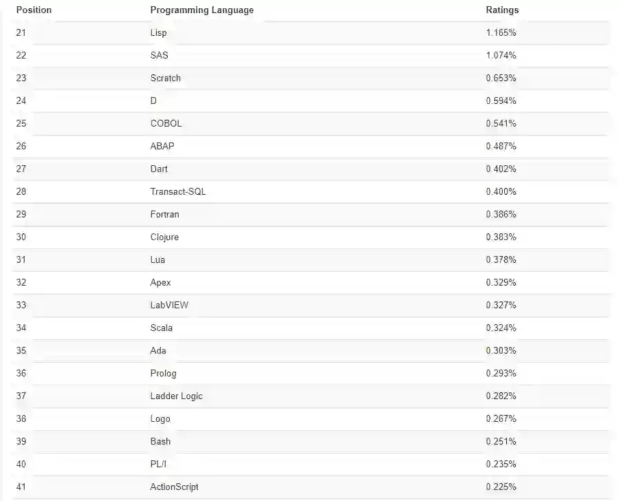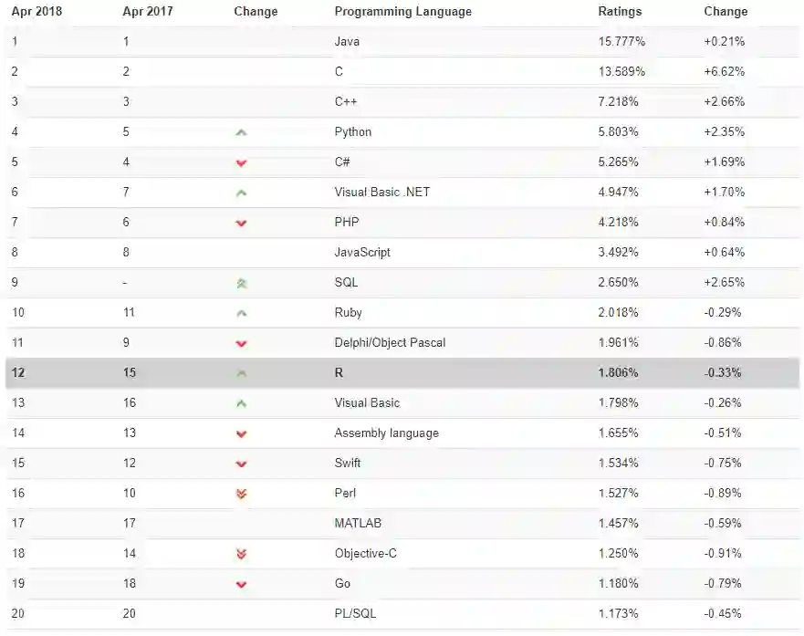 前 20 名中,涨幅最高的编程语言为 Java ,之后分别是 C、C++、Python、SQL 、Javascript 和 PHP 。