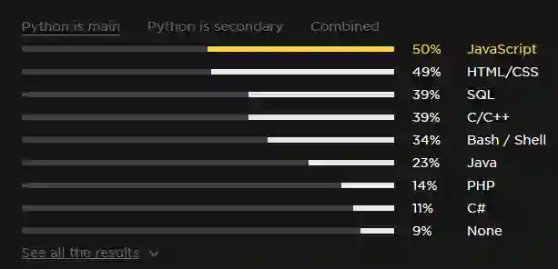 使用 Python 作为辅助语言的受访者更喜欢将其与JavaScript(46%),C / C ++(42%),Java(41%)和 C#(24%)这几门语言搭配使用。