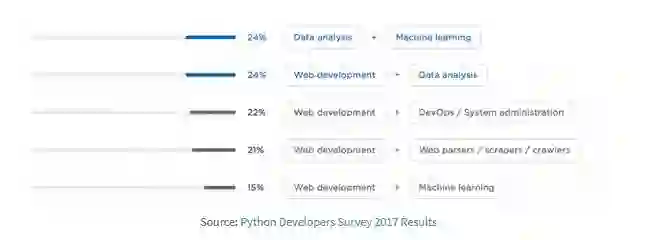 “2017 年 Python 开发人员调查”将数据分析和机器学习结合到一个单一的“数据科学”类别中时,结果显示 27% 的受访者都使用 Python 进行数据科学研究。