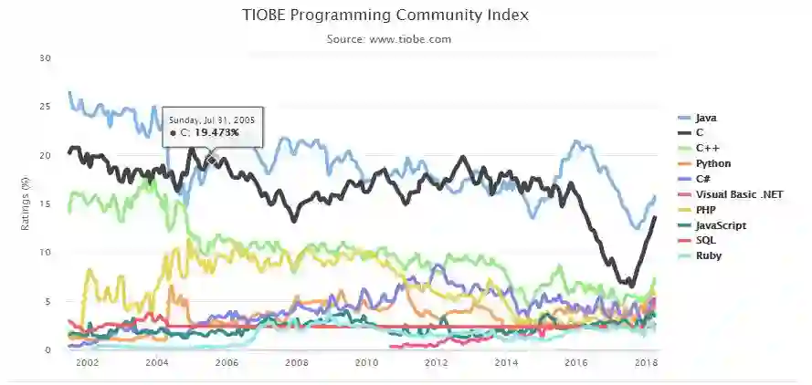 Top 10 编程语言 TIOBE 指数走势(2002-2018)