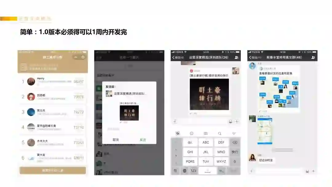 所以如果你的1.0版本的开发周期超过2周,说明还是App思维,最好是1周能开发出来(开发配置:1后端、1前端);我们最成功的几个小程序是1周左右开发出来的,用户反馈不错了,再不断迭代完善功能,而开发了最久的小程序是1个半月、推了几天却只获得2千的用户。