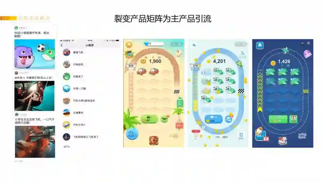 在这次的实验中,陆陆续续上线了10款不同类型的小程序(包含轻度/重度小游戏、电商、工具、社交),发现只有2个小程序产品、能把这些用户留住,其他产品的留存都很差