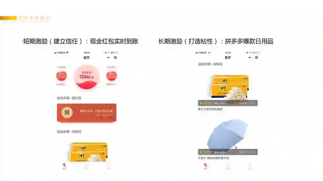 这个产品之所以能把用户留存做到这么高:一是通过人人都可参与的短期激励和用户快速建立信任,只要你的走路步数超过3000步,每天都可以领1个小红包。二是通过需要高额“运动步数”免费兑换拼多多爆款日用品的长期激励来黏住用户。