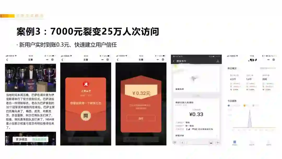 5月底我们做了个资讯类的小程序,测试“红包裂变”玩法:只要用户转发文章到群里面,会立即收到微信支付到账0.3元(1个用户1天有1次机会)。