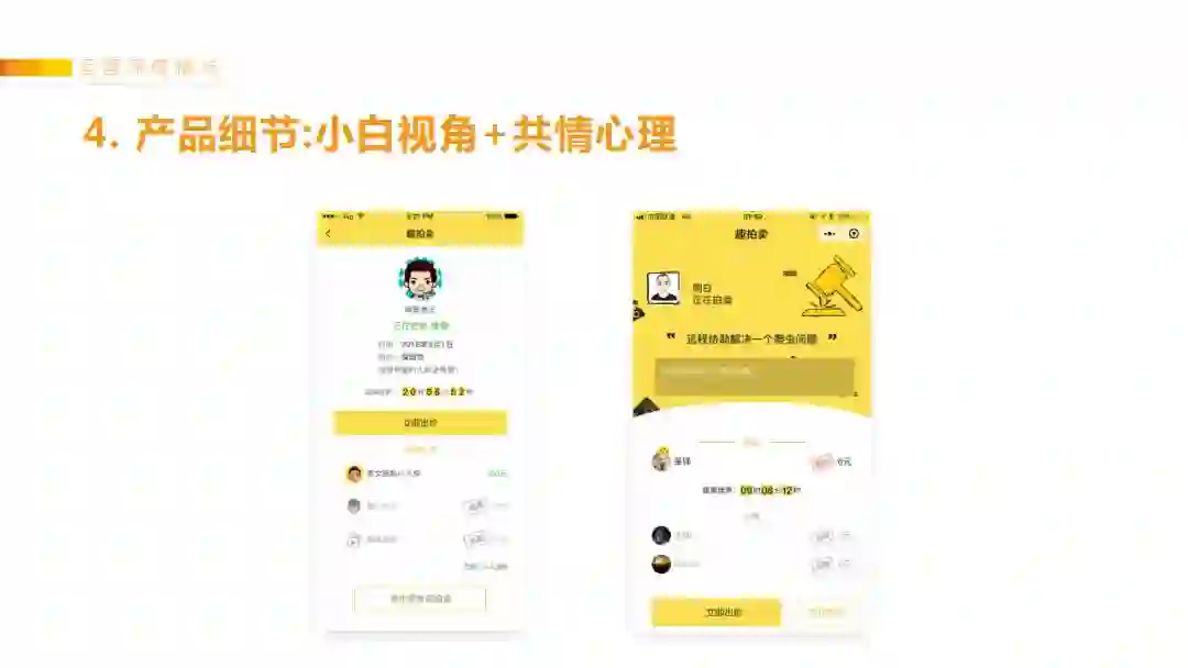 例如用户的第一名被抢走了,会有模板消息通知Ta。之前UI是把竞拍的1、2、3、4名排列放一起,但为了激发用户的竞争心理,所以第一名需要特殊对待、让他享受万众瞩目的感觉,失败的人则放在一起,冷淡加灰色蒙层处理。