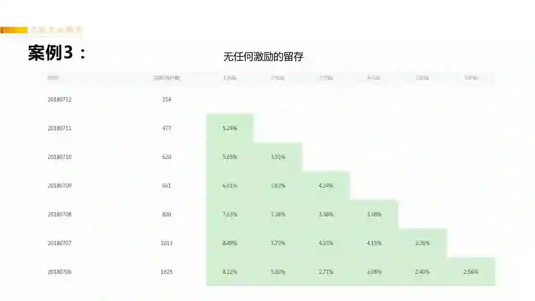 我们把“转发红包”停掉后,观察了“红包裂变来的用户”留存情况,在什么激励都没有情况下,发现两周后:正常的活跃用户只剩400~1000人,次日留存大概是5%-8%,7日留存只有2%。印证了:以利聚之、利尽则散。