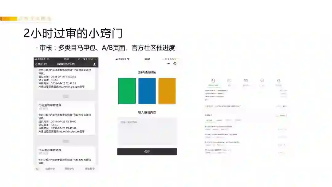 因为小程序的审核是外包出去的,每一家审核严格程度不一样。如果审核被拒,可以多尝试几个账号多试几次不同的类目,可以提高审核通过率(先查一下同行在什么类目,选择该类目的通过率比较高)。或1.0版本比较简单、1.1版本再迭代功能上线。很多人兴致冲冲得把小程序做得十全十美,结果发现审核过不了