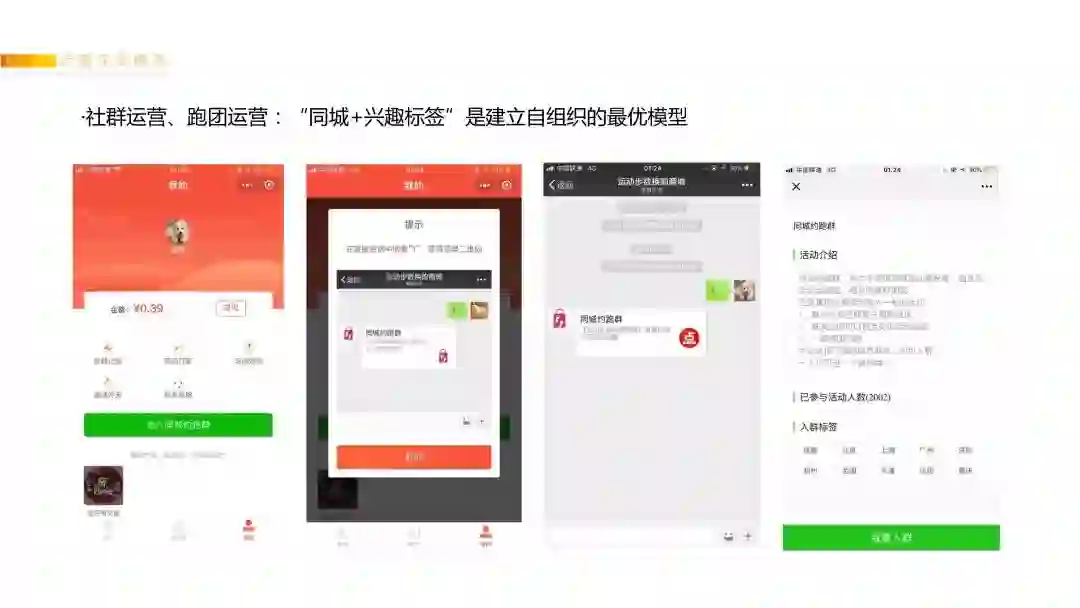 因为我们做过非常多的社群(累计各个号里的微信群人数超过100万人)。99%的社群都挂了,最终发现,有二十几个“同城+兴趣爱好”两者标签组合的微信群,到目前为止持续活跃了2年,而且都是用户自运营。