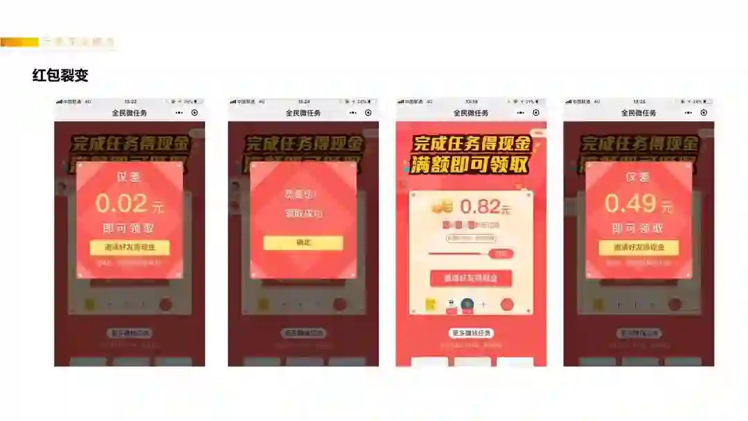 直到做了这些实验之后才发现,参与“红包裂变”的用户很大一部分是三五六线的全职宝妈,离退休中老年人。这些用户的共同特征是没有工作,她们是没有“生产价值”的,但每一个人生存在这个世界上,都需要有成就感、被需要感,而“签到送红包”的玩法就很好得满足了她们的心理空缺。