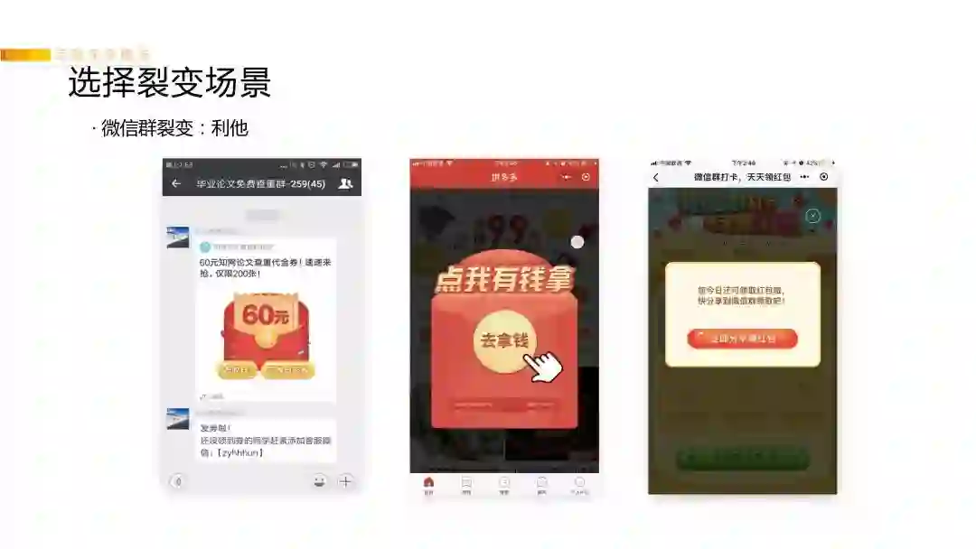 如果是要驱动用户分享到群,我们自己测试的在群里的点击率最高的是:“利他”的角度(比如文案:我送你们x个红包,你们快来领!),而不是“利己”的角度(比如文案:我正在抢x红包,大家快来帮我助力)。