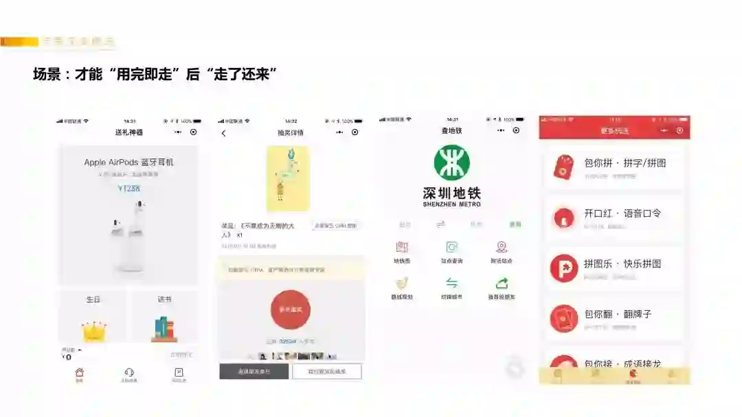 我一直在思考如何构建一个使用场景,能够让用户“用完即走”后“走了还来”,像在深圳坐公交地铁,用一个小程序:腾讯乘车码扫码就行,每次出行都会使用。