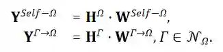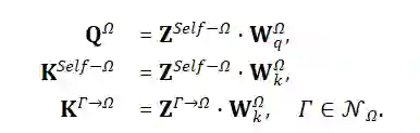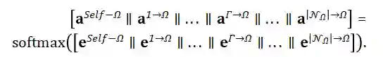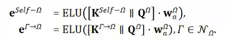 利用注意力机制将这些临时的特征聚合起来,从而全面地刻画目标对象的特性。首先,通过不同的参数将目标对象的自身投影特征映射为注意力的查询值和键值,也通过不同的参数将邻居的聚合特征映射为相应的键值: