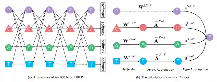 下图通过在DBLP上的一个模型实例展示了方法的基本流程。如左侧子图(a)所示,模型一共包含5层。在每一层,针对某个对象类型,都将其异质邻居的特征聚合过来(实线),同时也将其自身的上一层的特征聚合过来(虚线)。右侧子图(b)展示了针对P(Paper)类型对象的计算过程:(1)自身/邻居的特征投影;(2)利用归一化邻接矩阵聚合;(3)利用注意力聚合。