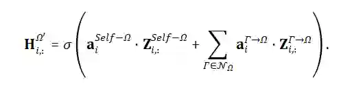利用归一化的注意力系数,将若干个临时特征聚合起来,形成目标对象本层输出的新的特征:
