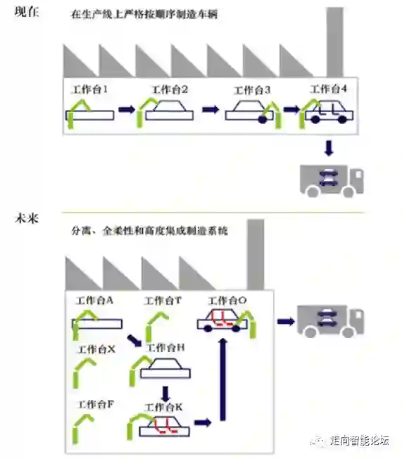 定制化生产也是德国工业4.0战略中非常关注的内容。德国工业4.0强调指出:“支持定制生产:如何满足客户个性化的需求,工业4.0的动态价值链能使客户和特定产品的设计、配置、订货、计划、生产和物流得到统一协调。这也为即时响应、生产前甚至在生产过程中最后一分钟的需求变更提供了支撑的可能。”并举例说:“实施工业4.0的结果是出现动态生产线。车辆成为可以通过装配车间从一个赛博物理系统功能处理模块到另一个自主移动的智能产品。动态重新配置生产线,使得它可以与合适车辆的设备混装并匹配。此外,个体差异(如从另一个车系列配备座椅)可以在任何时间根据物流情况加以执行(如瓶颈问题),而不被中控系统事先设定的时序所约束。执行这类重新配置将很简单,汽车可以自主移动到相关的工作站。现在的制造执行系统IT解决方案构成一个核心组成部分,从开始到结束——从设计到组装和操作。”请见图2。