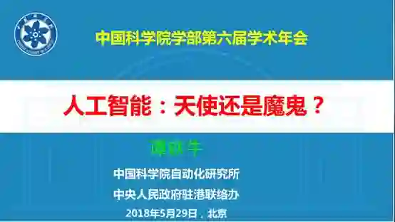 5月29日,谭铁牛院士在第十九次中科院院士大会上发表了《人工智能:天使还是魔鬼》的主题报告,深度解读了60多年来人工智能发展历史,人工智能的七大现状,发展趋势、展望和现有人工智能的局限性等。面对各界对人工智能的期待和愿景,谭院士认为:“人工智能的春天刚刚到来”。