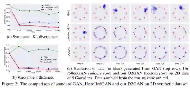 在第一个实验中,使用已经设计好的实验方案对D2GAN处理多模态数据的能力进行评估。特别的是,从2D混合8个高斯分布和协方差矩阵0.02I 获取训练数据,同时中位数分布在半径2.0零质心的圆中。使用一个简单的架构,包含一个生成器(两个全连接隐藏层)和两个鉴别器(一个ReLU激发层)。这个设定是相同的,因此保证了公平的对比。图2c显示了512个由D2GAN和基线生成的样本。可以看出,常规的GAN产生的数据在数据分布的有效模式附近的一个单一模式上奔溃了。而unrolledGAN和D2GAN可以在8个混合部分分布数据,这就印证了能够成功地学习多模态数据的能力。最后,D2GAN所截取的数据比unrolledGAN更精确,在各种模式下,unrolledGAN只能集中在模式质心附近的几个点,而D2GAN产生的样本全分布在所有模式附近,这就意味着D2GAN产生的样本比unrolledGAN多得多。