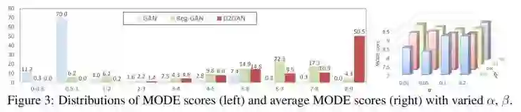 为了研究α和β的影响,在不同的α和β的数值下进行试验(图3右)。结果表明,给定α值,D2GAN可以在β达到一定数值时获得更好的MODE score,当β数值继续增大,MODE score降低。
