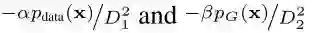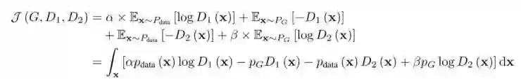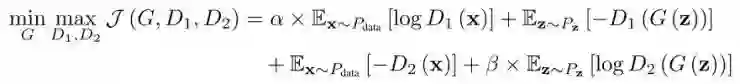 其中超参数为了实现两个目的。第一个是为了稳定化模型的学习过程。两个鉴别器的输出结果都是正的,D1(G(z))和D2(x)可能会变得很大并比LogD1(x)和LogD2(x)有指数性的影响,最终会导致学习的不稳定。为了克服这个问题,降低α和β的值。第二个目的是控制KL和反KL散度对优化的影响。后面介绍过优化方法后再对这个部分进行讨论。