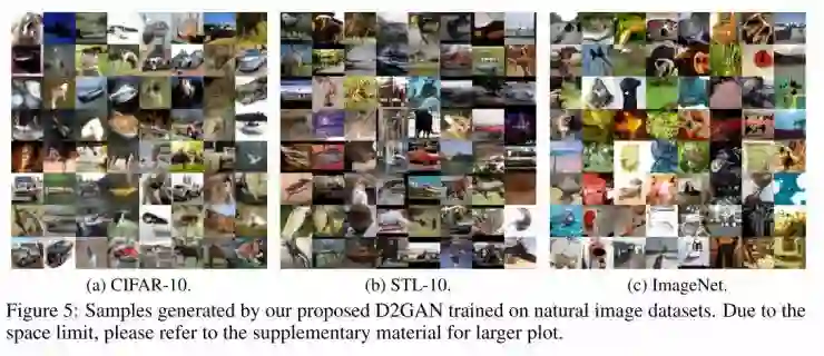 最后,在图5中展现了使用D2GAN生成的样本图片。这些图片都是随机产生的,而不是特别挑选的。从图片中可以看出,D2GAN生成了可以视觉分辨的车,卡车,船和马(在CIFAR-10数据库的基础上)。在STL-10的基础上,图片看起来相对比较难以辨认,但是飞机,车,卡车和动物的轮廓还是可以识别的;同时图片还具备了多种背景,如天空,水下,山和森林(在ImageNet的基础上)。这印证了使用D2GAN可以生成多样性的图片的结论。