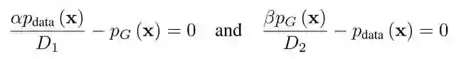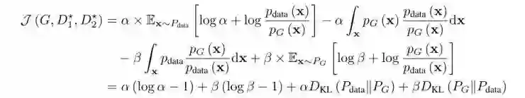 分别是KL和反KL散度。这些散度通常是非负的,并且只在PG*=Pdata时等于0。换言之,生成器生成的分布PG*与数据分布完全等同,这就意味着由于两个分布的返回值都是1,两个鉴别器在这种情况下就不能分辨真假样本了。