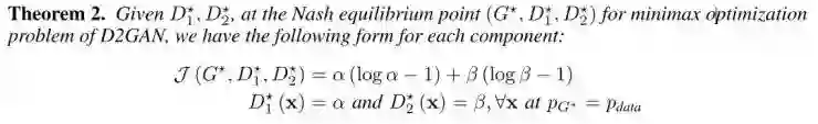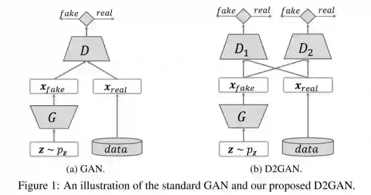 与GAN相似的是,通过交替更新D1、D2和G可以训练D2GAN。