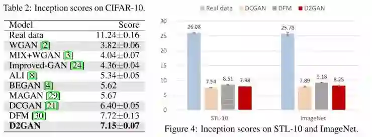 作者通过大量的实验对其提出的方法进行了验证。这些实验的结果证实了D2GAN的高效性和扩展性。实验使用的数据库包括合成数据库和大规模真实图片数据库,即MNIST、CIFAR-10,STL-10和ImageNet。相较于最新的基线方法,D2GAN更具扩展性,可以应用于业内最为庞大和复杂的数据库ImageNet,尽管取得了比融合DFM(denoising feature matching)和GAN的方法低的Inception score,但远远高于其他GAN应用的实验结果。最后,作者指出,未来的研究可以借鉴融合DFM和GAN的做法,在现有的方法基础上增加类似半监督学习、条件架构和自动编码等的技术,更进一步的解决生成对抗网络在应用中的问题。