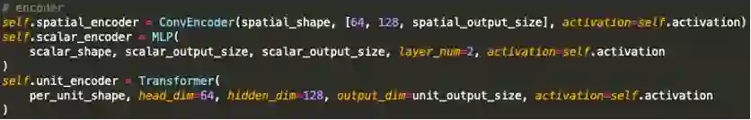 来实现。对于各种模态的观察信息,使用数据对应的经典神经网络架构即可。例如,对于图像信息,选择一个带降采样的卷积神经网络将2D图像编码为特征向量;对于单位属性信息,需要建模各个单位之间的联系,获得最终的单位特征向量;对于全局信息,则使用由全连接层构成的多层感知机。