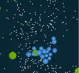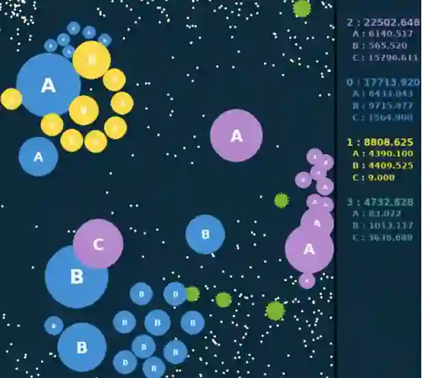 与风靡全球的agar.io、球球大作战等游戏类似,在Go-Bigger中,玩家(AI)控制地图中的一个或多个圆形球,通过吃食物球和其他比玩家球小的单位来尽可能获得更多重量,并需避免被更大的球吃掉。每个玩家开始仅有一个球,当球达到足够大时,玩家可使其分裂、吐孢子或融合,和同伴完美配合来输出博弈策略,并通过AI技术来操控智能体由小到大地进化,凭借对团队中多智能体的策略控制来吃掉尽可能多的敌人,从而让己方变得更强大并获得最终胜利。