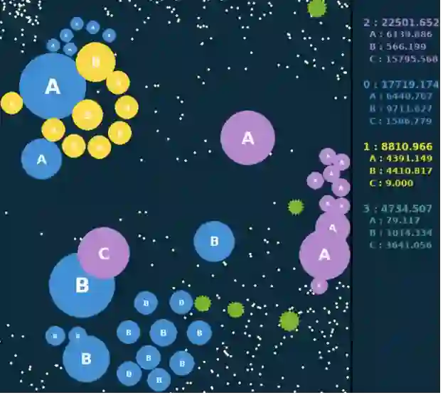 。因此,Go-Bigger设计了一系列的规则来提高团队所能带来的收益。由于玩家的分身球重量越小,移动速度越快,更多的分身可以保证快速发育,但是会面临被其他玩家吃掉的风险。同时,冷却期的存在使得玩家无法靠自身摆脱这样的风险。因此,同一队伍中不同玩家的配合尤为关键。