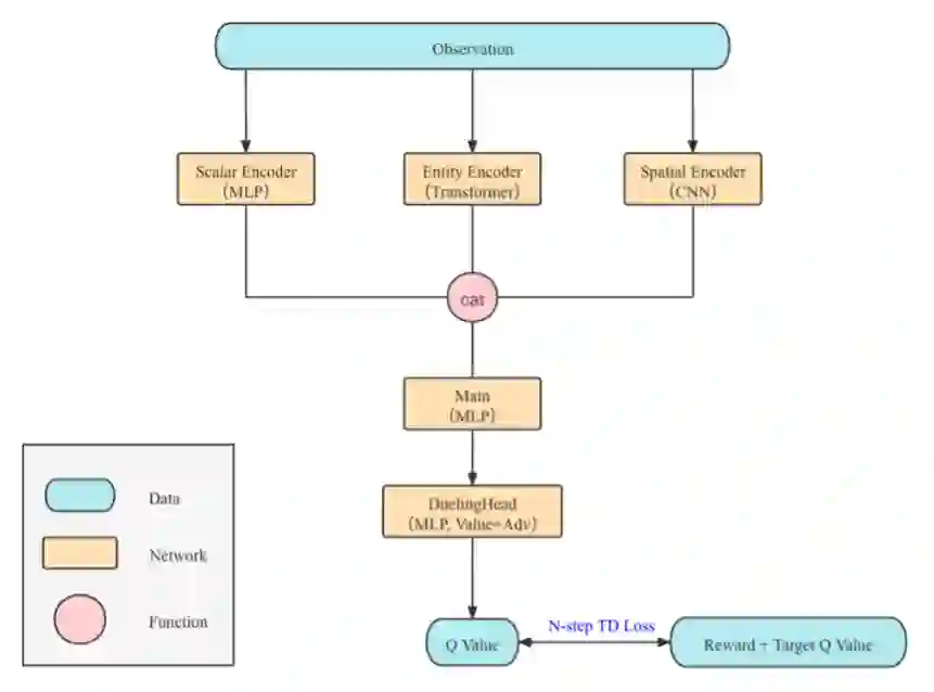 在各部分编码完成之后,将三部分的特征拼接在一起,将构成时间步的观察特征向量,以复用最经典的Dueling DQN结构。以特征向量为输入,输出这一步选择16个动作的Q值,并使用N-step TD损失函数即可完成相应训练的优化。完整的神经网络结构如下图所示。