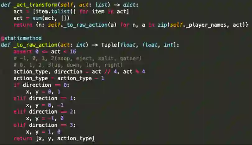 例如,对于一个队伍中的多个智能体,团队的最终目标是让整个队伍(总体积/总体量/总重量)的大小最大,因此在baseline中可使用IQL算法来实现,以高度并行化地实现整个优化过程;对于实际一局比赛中存在多个智能体的情况,则可使用朴素的自我对战(Self-Play)这一相当简单且非常节省算力的方式来参与比赛。评测时,会将随机机器人和基于规则的机器人作为比赛的对手,测试验证目前智能体的性能。