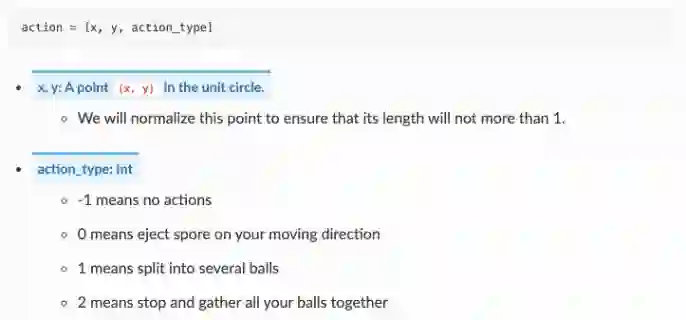 标准的接口供其使用。在一局游戏中,Go-Bigger默认设置含有20个状态帧和5个动作帧。每个状态帧都会对当前地图内所有单位进行仿真和状态处理,而动作帧会在此基础上,附加对单位的动作控制,即改变单位的速度、方向等属性,或使单位启用分裂、发射或停止等技能。