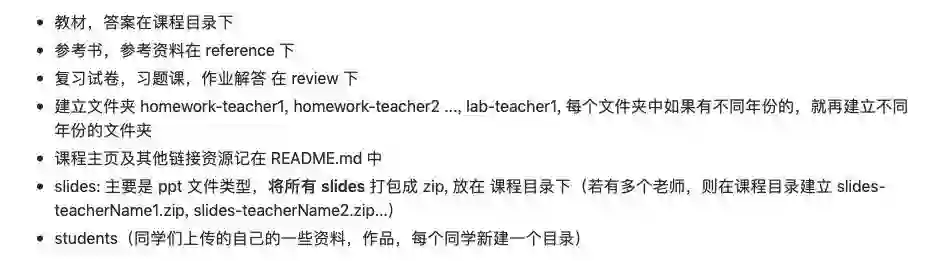 不过,笔者还是要提醒大家:不要随意上传带有版权的资源,此项目的版权约定已在 README 上写明。同时,作者也在联系老师征询涉及到的讲义、作业、实验等内容的授权。