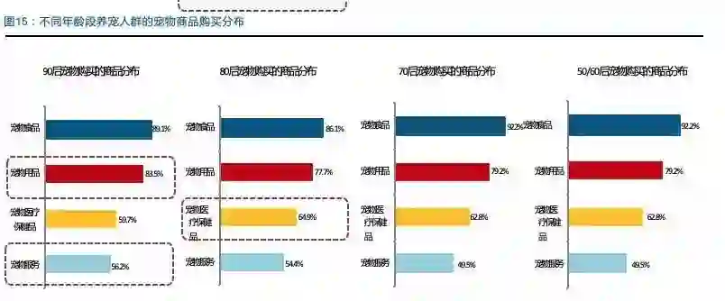 年轻消费群体宠物消费更高,在满足宠物主粮的基础上,在宠物用品以及宠物服务上愿 意花费更多的投入。从不同年龄段养宠人群的宠物商品购买分布来看,各年龄段购买最多的都是宠物食品,对比来看,80 后更重视宠物的医疗和保健,而 90 后在宠物用品和 宠物服务上则倾向投入更多。现阶段,80 后是宠物支出最多的消费群体,80 后每月的 宠物支出比 70 后多 80 元左右,综合来看,每年将多花费 1000 元左右,我们认为,一方面 80 后的收入水平快速提升,另一方面他们的养宠观念也相对领先。随着 90 后年龄 的增长以及收入的增加,他们将是宠物消费的潜力增长点。